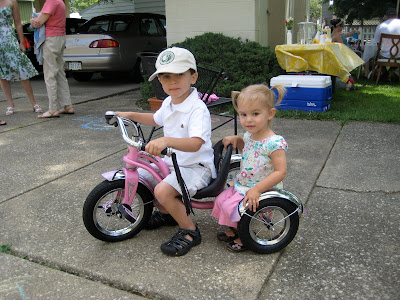 Maya and her friend Adam at Isabella's birthday party (on Isabella's new tricycle)
